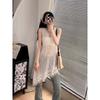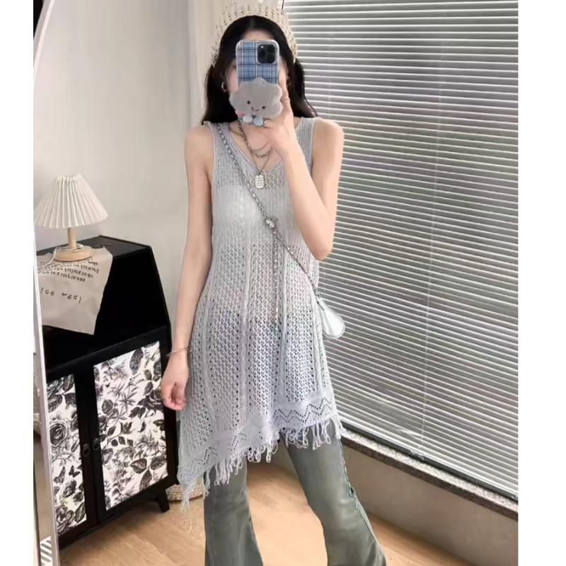 New V-neck Fringed Knitted Sleeveless Dress 2025 Fall Women's Fashion Loose Hollow Long Blouse Vest Casual Knit Tanks Top Tassel Hollow Thin Blouse
