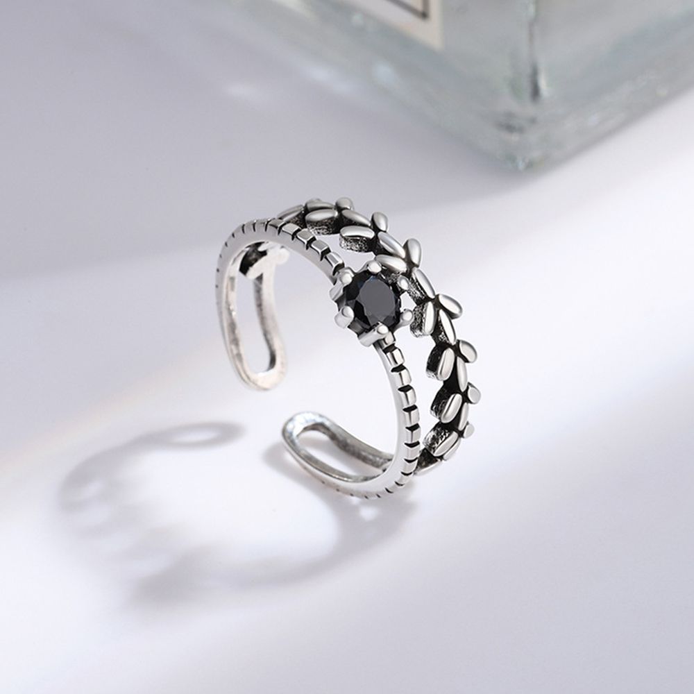 Obsidian Layered Two-Line Leaf Ring Couple Pretty Family Student