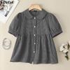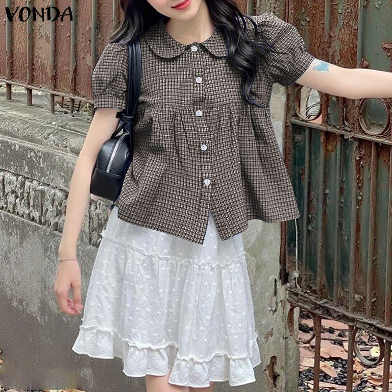 VONDA Women Doll Collar Puff Sleeve Button Up Plaid Blouse Tops