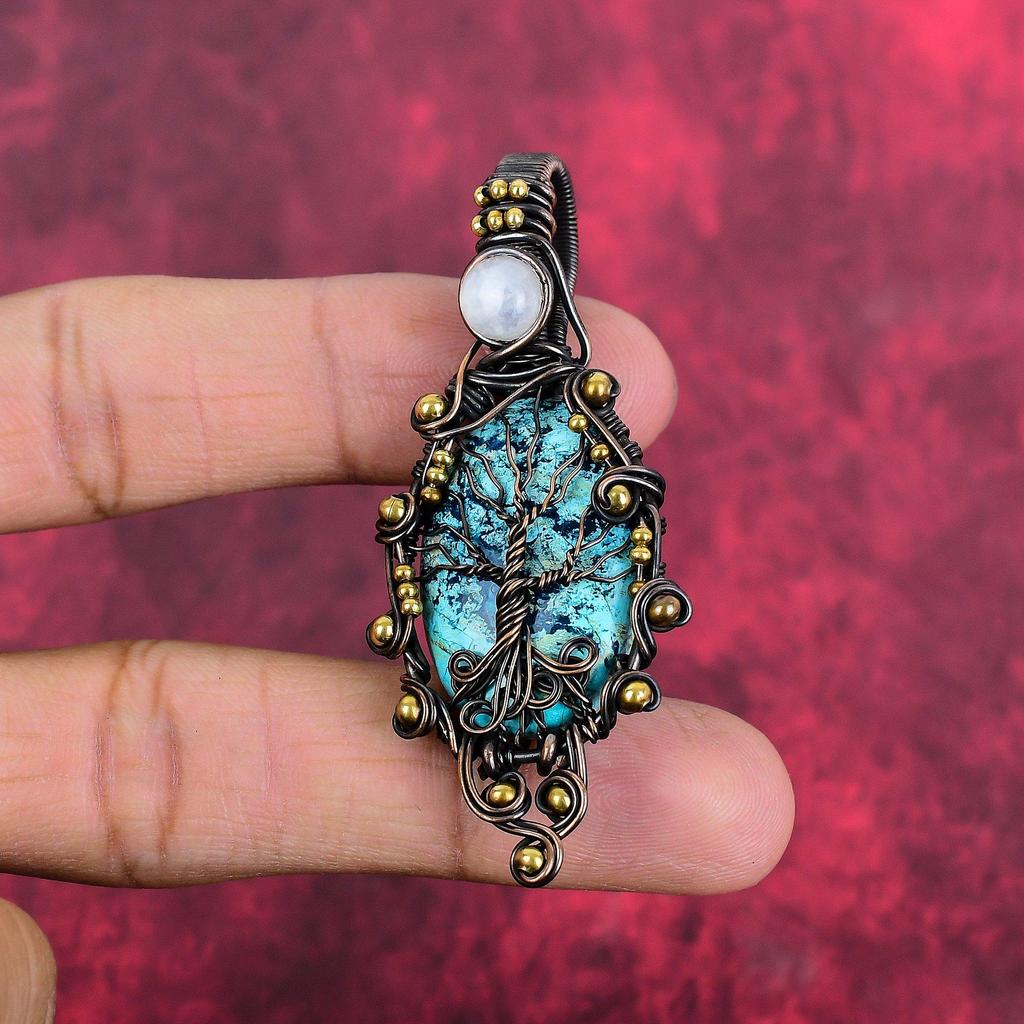 Tree of Life Chrysocolla Pendant Copper Wire Wrapped Jewelry Rainbow Moonstone Gemstone Pendant Gifts for Wife Handmade Copper Wire Pendant