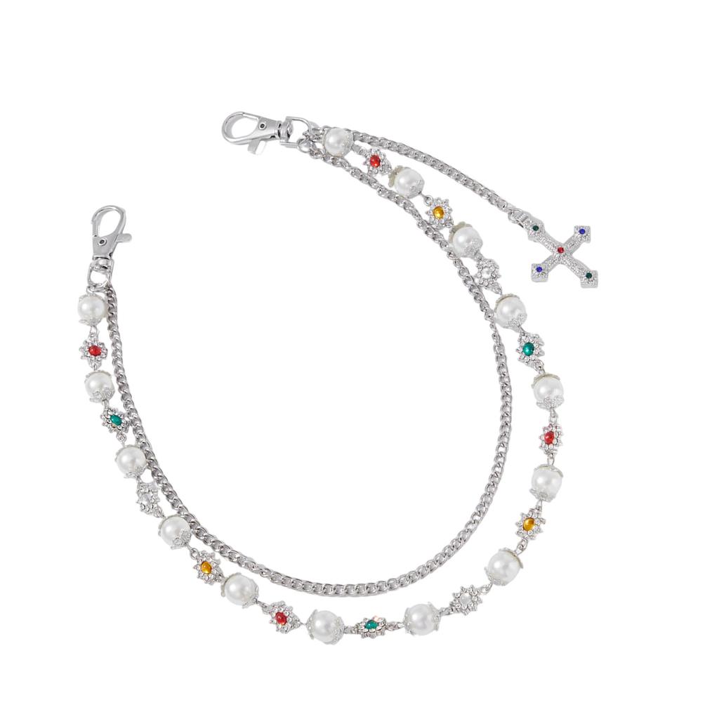 An eye catching fusions of gothic symbolism and delicate pearls accent, this unisex chain belt doubles as edgy rave jewelry or festival ready waist accessory.