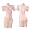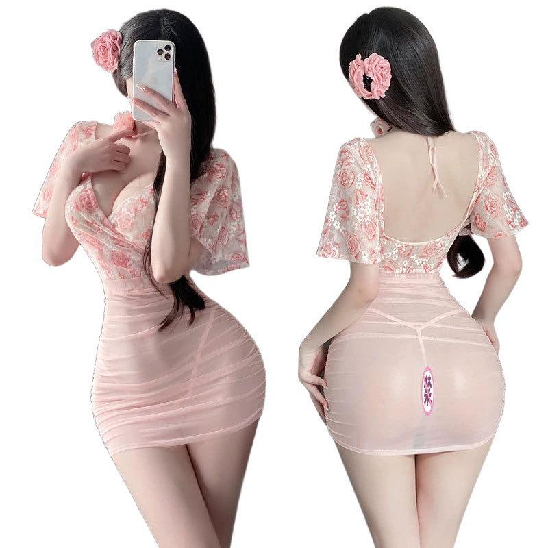 Sex Underwear Sexy Perspective, Deep V Floral Hip Skirt Rose Veil High Waist Tight Dress Set
