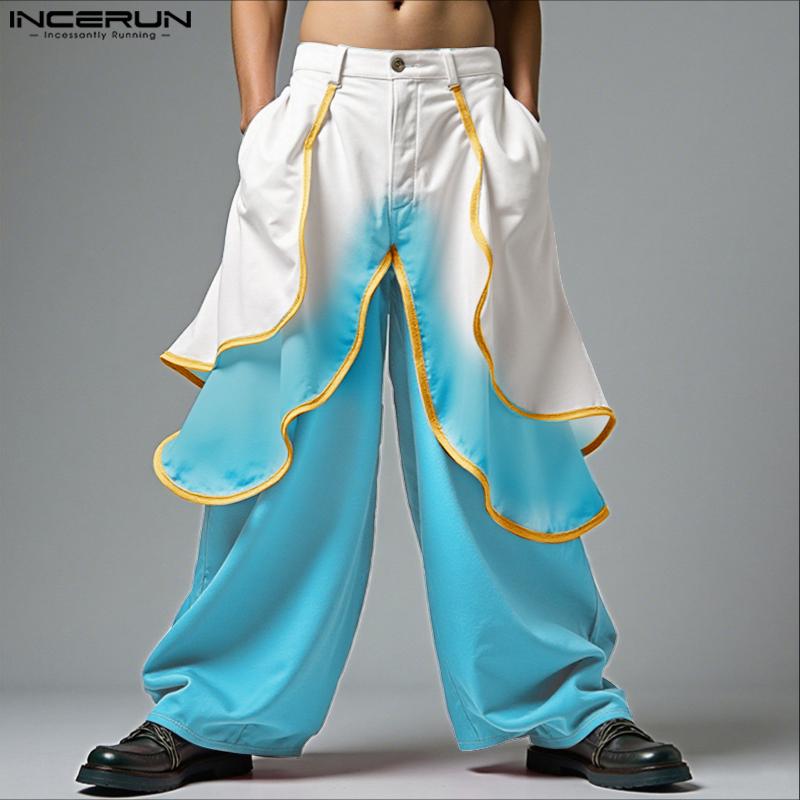 INCERUN Men Layers High Waist Zip-up Casual Loose Gradient Wide Legs Pants Long Trousers