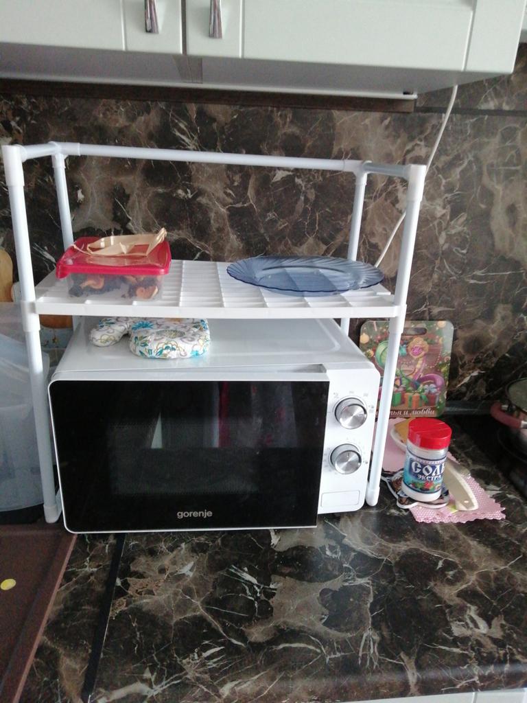 Open Storage Kitchen Rack with Microwave Oven Compartment - Durable Plastic, Two-Tier Design for Efficient Organization, Features Utensil Holders