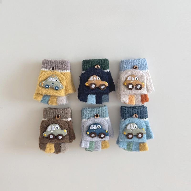 1 Pair Kids Half Finger Gloves Winter Warm Boys Thermal Mittens with Cool Car Pattern Toddler Baby Anti-Slip Touchscreen Gloves