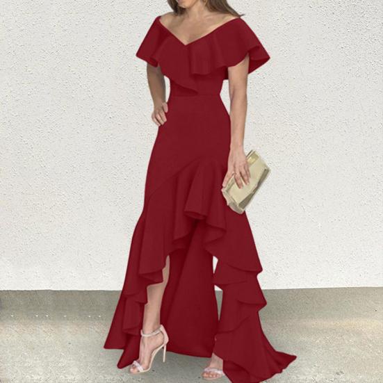 Elevate your style with this stunning Women's V-neck Ruffled Maxi Dress. The unique splicing design accentuates your figure, creating a slimming effect. Featuring a high-low hemline, this dress exudes elegance and charm.