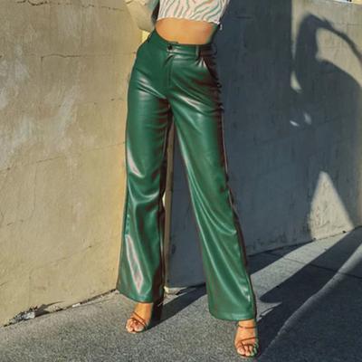 Faux Leather Women Pants Button Zipper Fly Straight Wide Leg Trousers with Pockets High Waist Loose Fit Long Pants