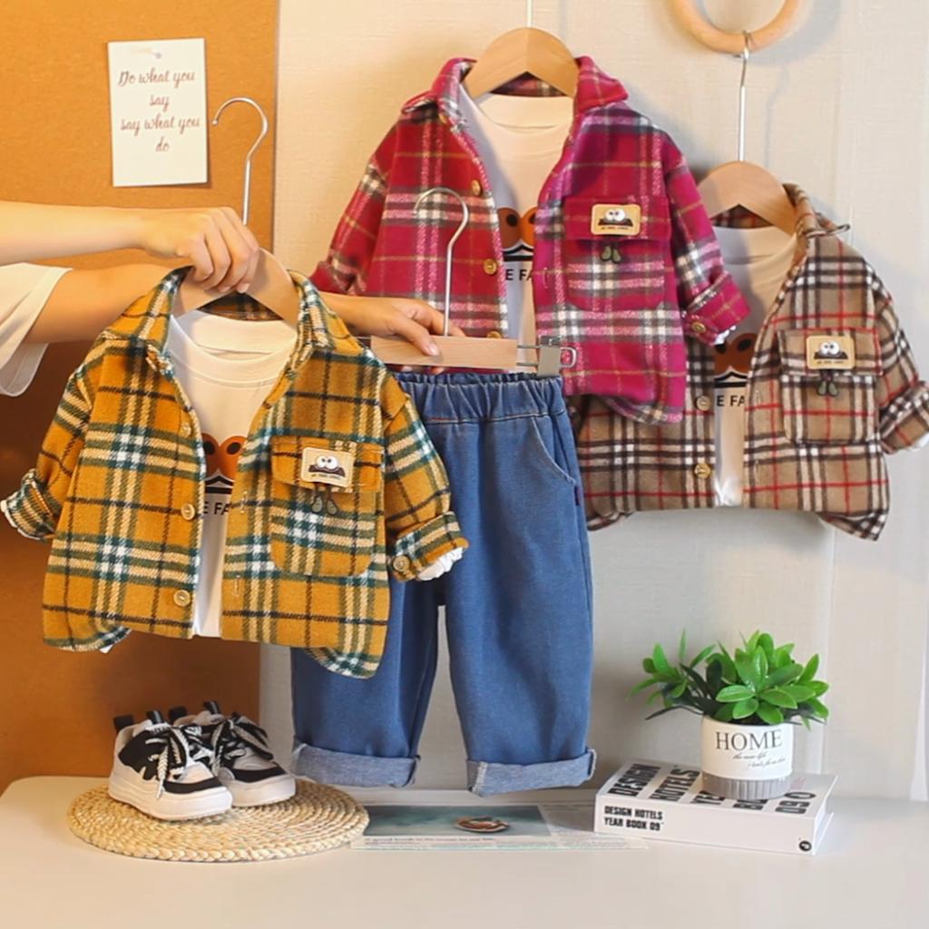 Boys' Long Sleeved 3-piece Set, 0-5-year-old Children's Checkered Shirt Jacket, White T-shirt, Casual Denim Pants, High-quality Clothes