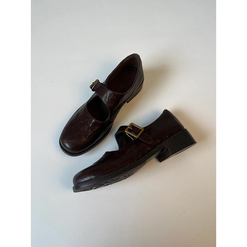 Sheepskin Version~ Retro Commuter Mary Jane Shoes Women's Round Head Thick Heel Leather Single Shoes Versatile One-word Buckle Belt Small Leather Shoe
