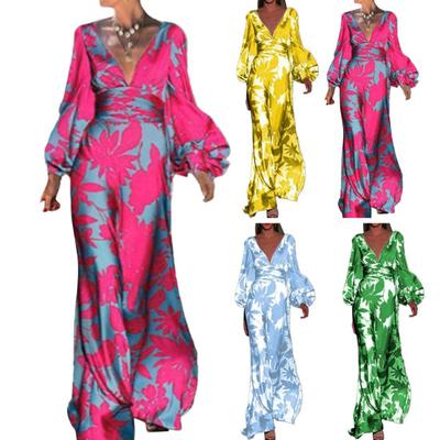 Women's Fashion Sexy Long Print V-Neck Long Sleeves Puff Sleeve Dress