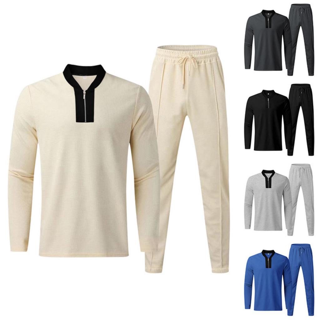 Men's And Women's Solid-color Casual Long-sleeved And Long Pants Set, Men's Spliced Stand-up Collar Half Zipper Casual Set