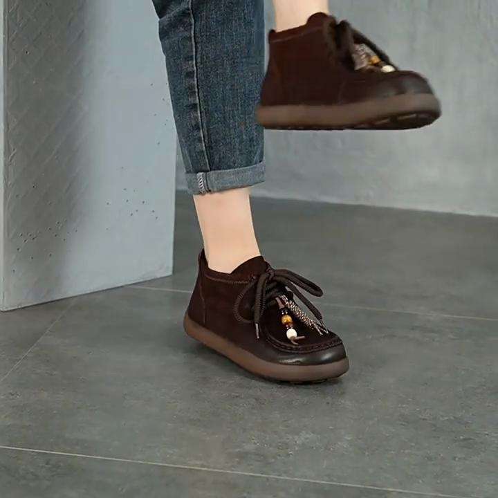 Johnature Genuine Leather Round Toe Lace-up Flat Ankle Boots Casual Versatile Women's Shoes
