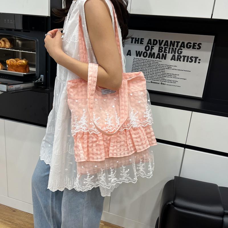 Vintage Mori Women's Style Heavy Industry Lace Splicing Cotton and Linen Shoulder Bag 25 Summer Handbag Bag Large Capacity Handbag