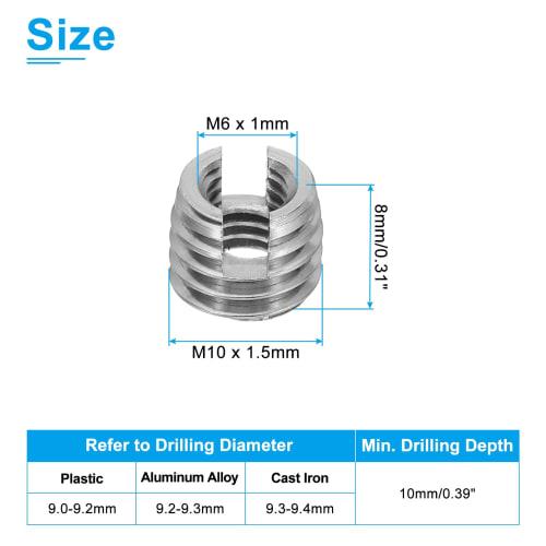 - Specifications: Internal thread size: M6 x 1mm (diameter x pitch); external thread size: M10 x 1.5mm (diameter x pitch); thread length: 8mm/0.31"; minimum drilling depth: 10mm/0.39"; drilling diameter reference: 9.0-9.2mm (plastic), 9.2-9.3mm (aluminum alloy), 9.3-9.4mm (cast iron); Material: 303 stainless steel; Color: Silver tone; Package list: 40 pieces x self-tapping inserts (302 type)
