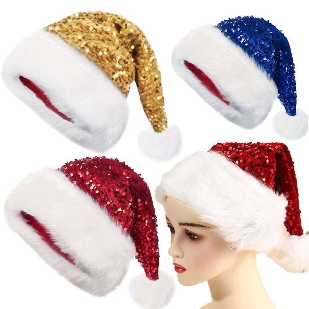 A classic plush Santa hat featuring a glittery sequin pattern. The sequins catch the light to display shifting colors under the sun, making you stand out bright and festive at winter Christmas Eve parties