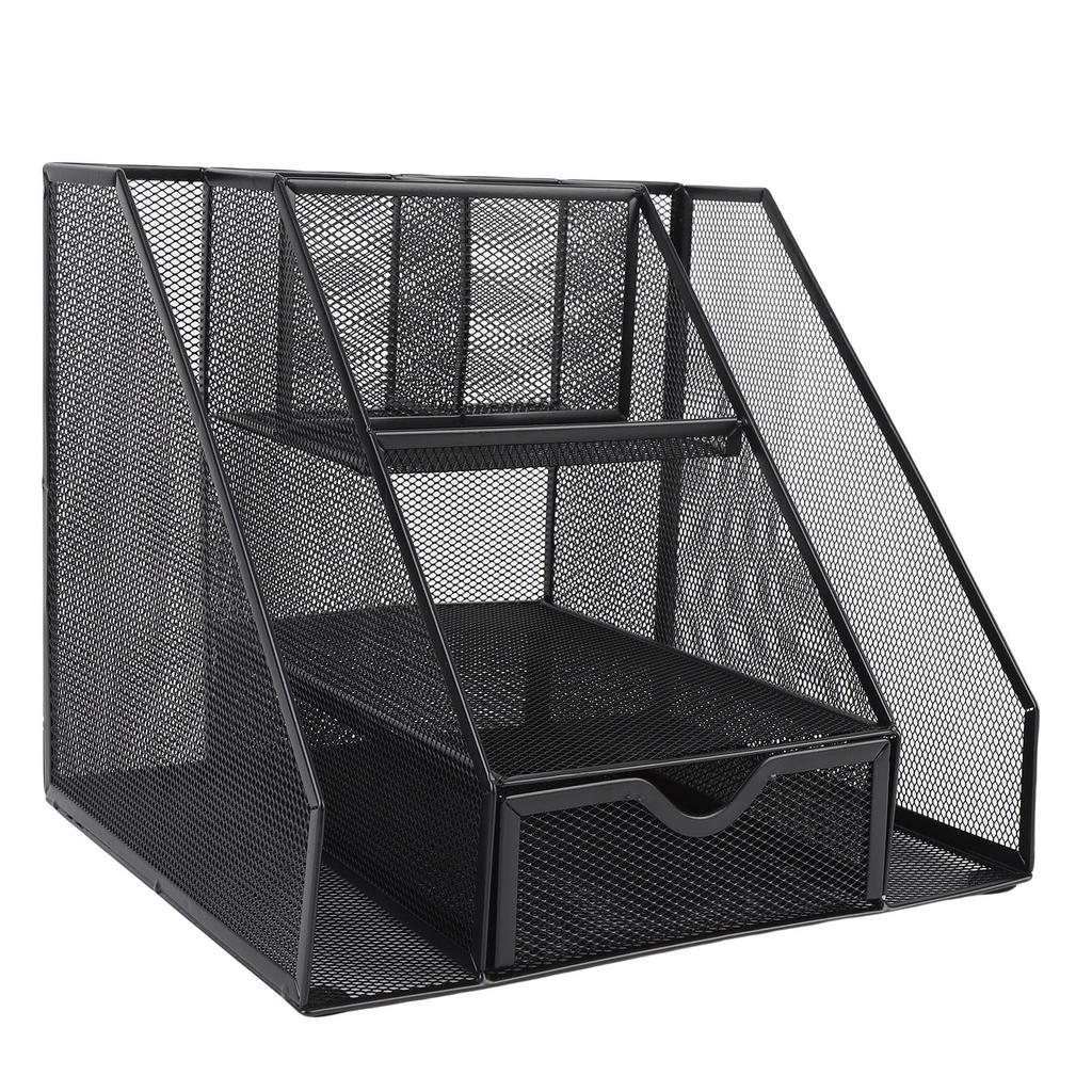 Metal Mesh Desktop Organizer Iron Vertical Storage Basket with Drawer Letter Box Pen Holder Office Supplies Black