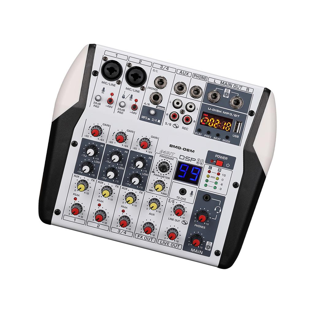 BOMGE 6 Channel DJ Audio Sound Mixer Professional Soundboard Stereo Recording MP3 USB BT Input 48V Phantom Power 99 DSP