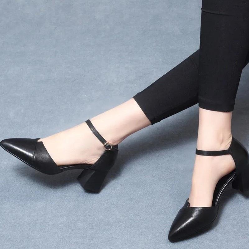 Soft Leather Mid-heel Comfortable Pointed Head Summer Bridesmaid Thick Heel One-word Buckle Bag Head Hollow Shallow Mouth Versatile Temperament Sandal