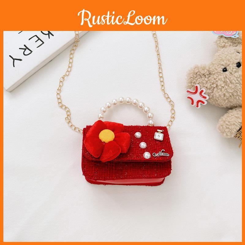 Red Kids Chain Crossbody Bag With Flower And Artificial Pearl Design Handle