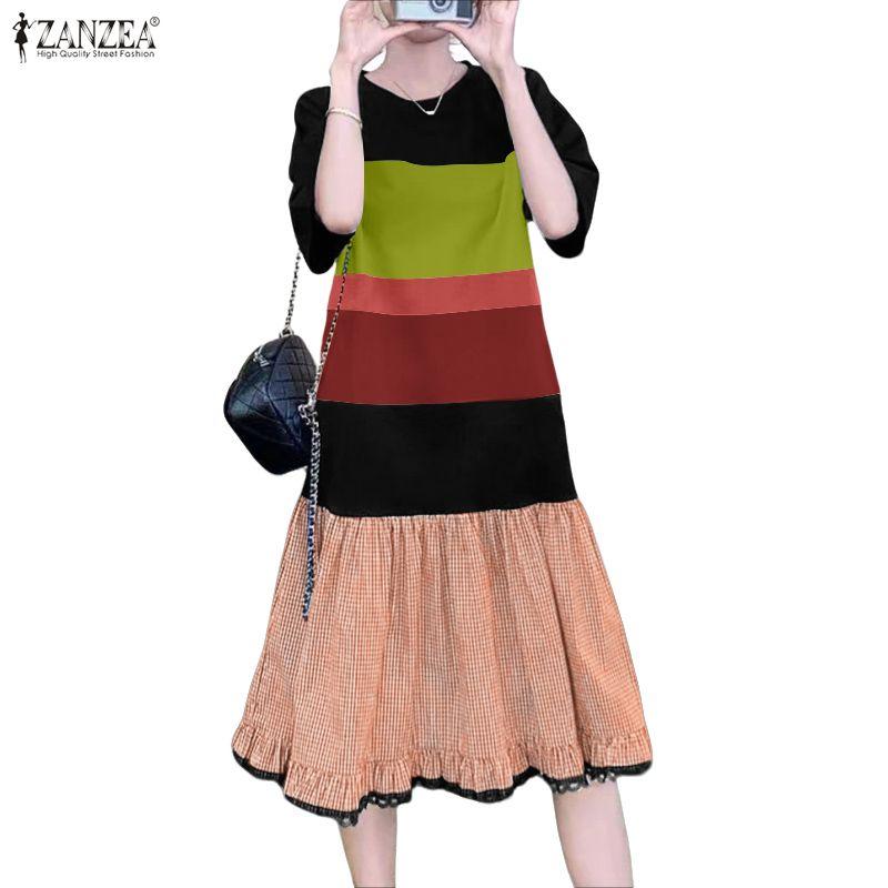 ZANZEA Women Casual Round Neck Summer Patchwork Short Sleeve Dress