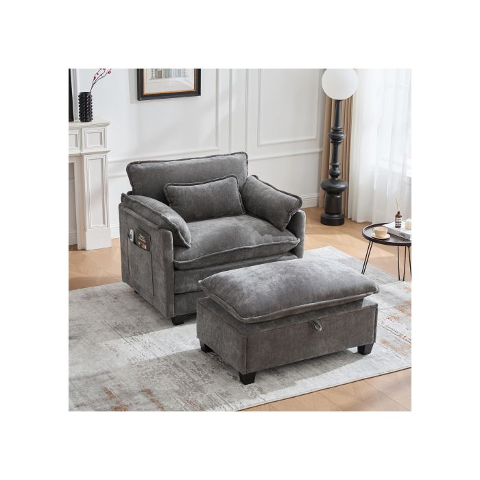 Fauteuil moderne - MUVOE - Chaise longue - Tissu chenille - Repose-pieds - Poche latérale