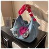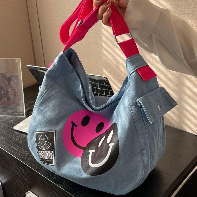 2024 New Korean Style Women's Denim Crossbody Bag: Artistic Smiley Face Canvas with Wide Shoulder Strap