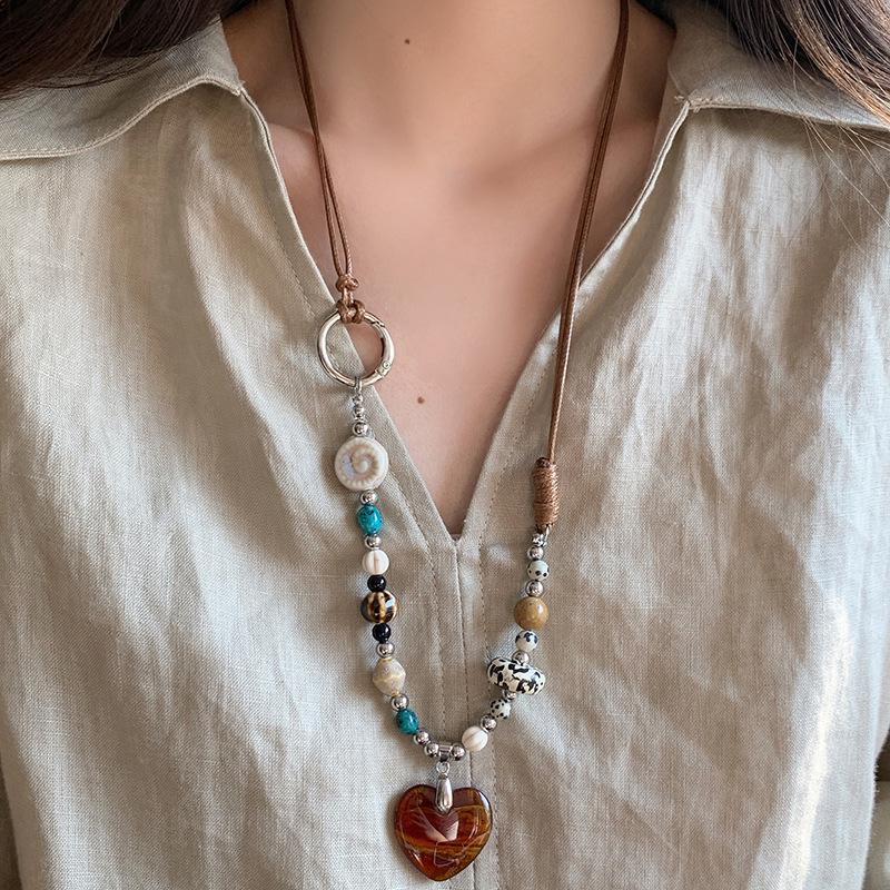 Vintage Ceramic Beaded Heart Pendant Necklace - Minimalist Luxury Clavicle Chain