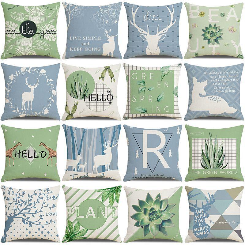 Ins Style Nordic Simple Geometric Abstract Small Fresh Green Plant Elk Linen Print Square Pillowcase