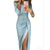 Spring Autumn One Word Collar Elegant Shiny Slit Bodycon Robe Women Long Sleeve Waist Evening Dresses Vestidos