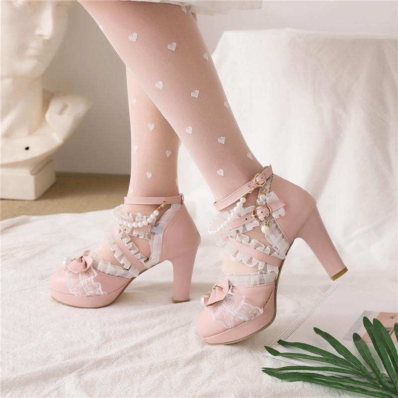 FOREADA Women Kawaii Mary Janes Pumps Round Toe Glove Shoes Thick High Heels Lolita Buckle Bow Ladies Fashion Cosplay Shoes Spring Autumn