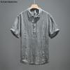 Retro Japanese Men's Crinkled Linen Shirt - Solid Color Short Sleeve with Stand Collar