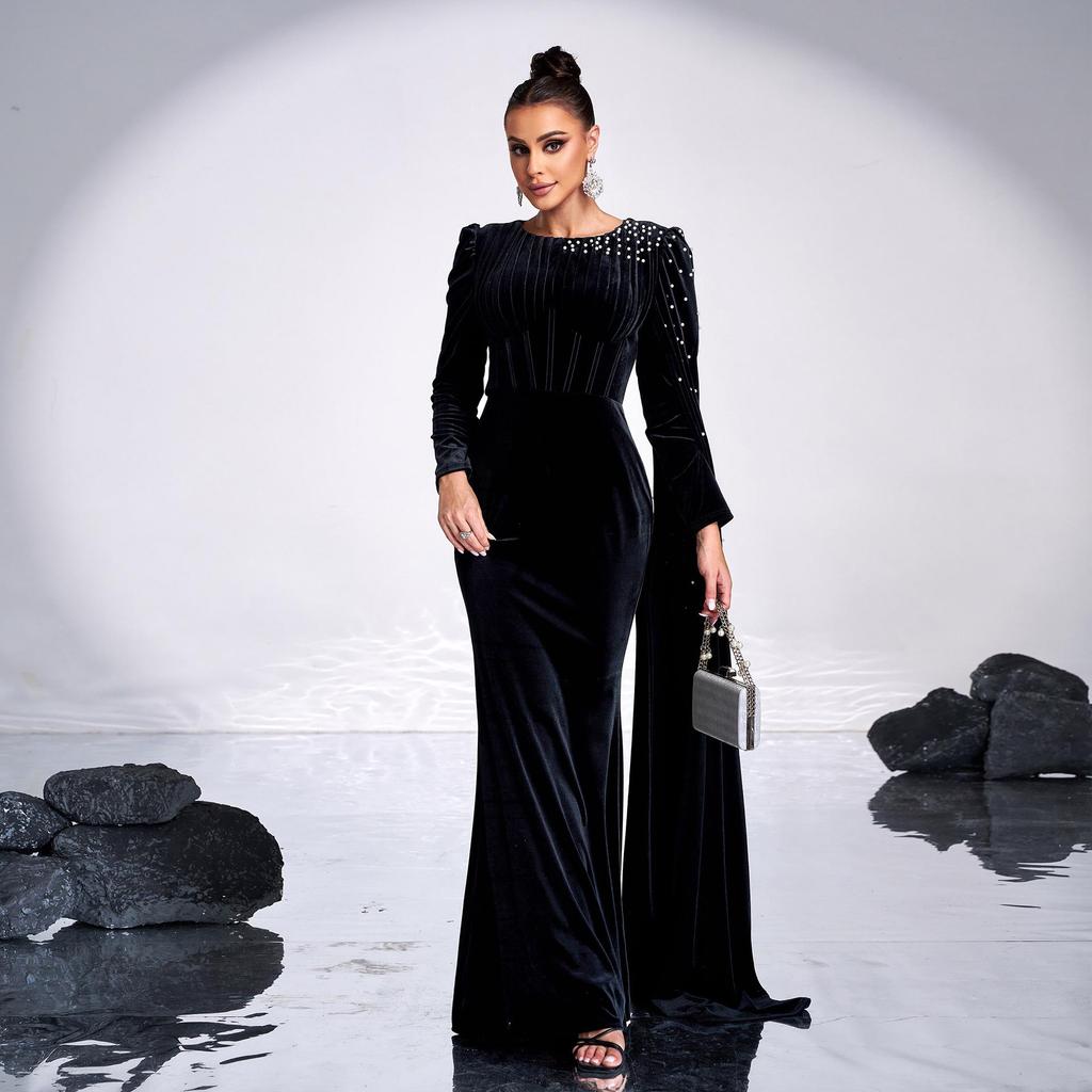 This sophisticated evening gown epitomizes elegance with its round neck and long sleeves, designed for those seeking a graceful presence at special events. Crafted from high-quality polyester, the gown offers a smooth and comfortable fit, ensuring you look stunning throughout the evening. Its timeless design and luxurious feel make it an essential choice for any formal occasion.