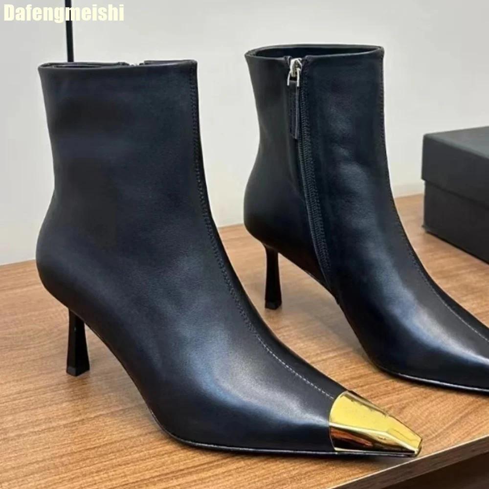 Metal Square Toe Short Boots for Women 2025 New Autumn Winter Plus Velvet Genuine Leather Sexy High Heels Stiletto Knight Boots
