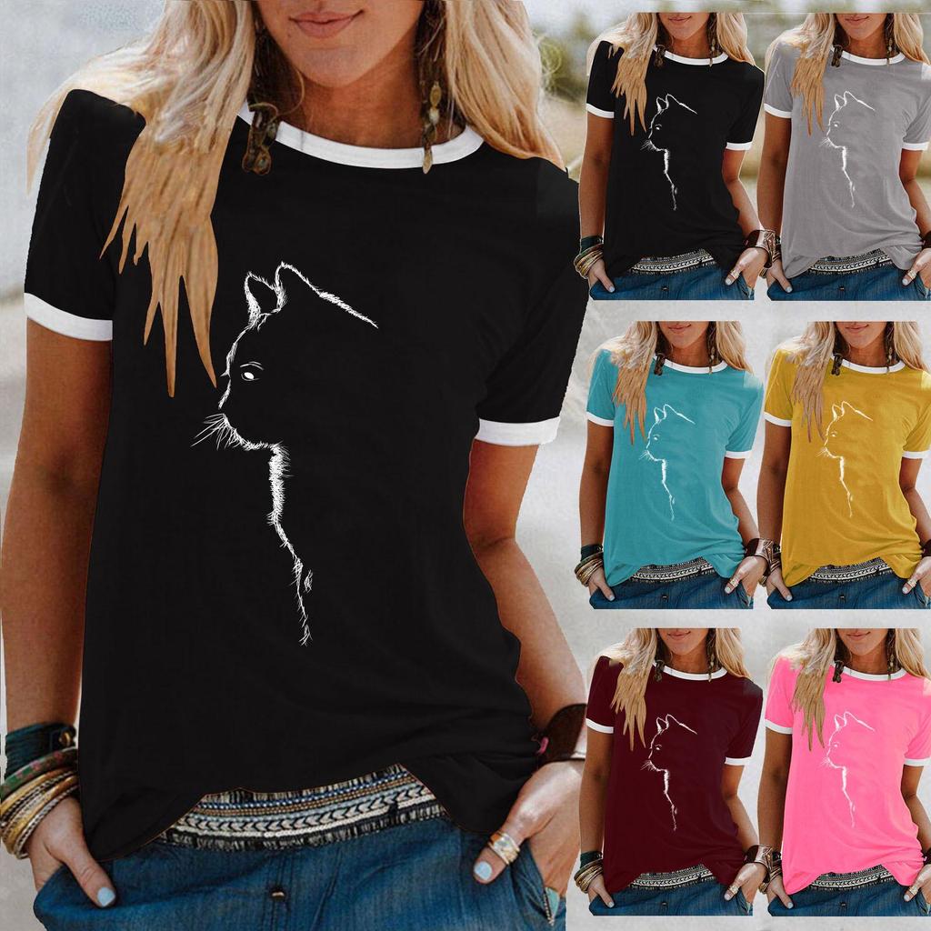 Embrace a playful summer style with this charming women's T-shirt, crafted from a comfortable cotton blend. Featuring a cute cat print, this top combines a relaxed, loose fit with a classic round neckline and short sleeves, perfect for keeping cool on warm days. The delightful print decoration adds a touch of whimsy, making it a fun addition to any casual wardrobe.