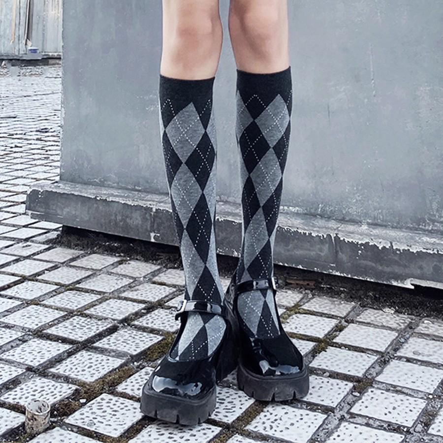 Women's Black and White Diamond Knee-High Socks - Trendy Japanese JK Style for Autumn and Winter