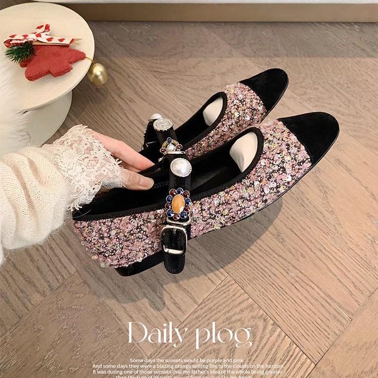 Sheepskin Version of the Same Princess Anne Xiaoxiangfeng Tweed Badge Buckle Mary Jane Single Shoes Women's Banquet Wedding Shoes