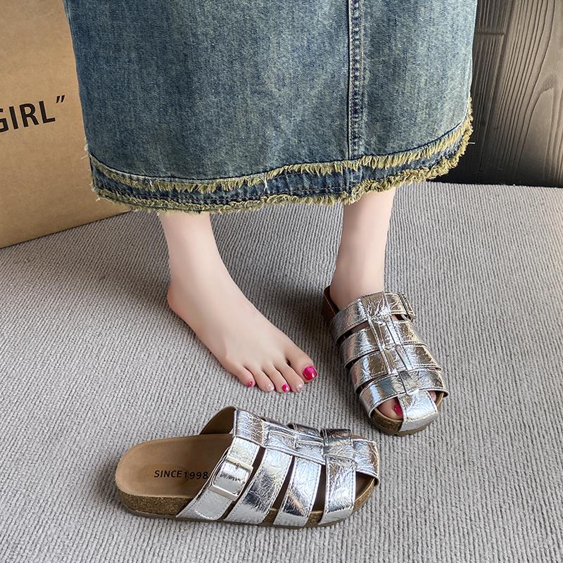 Office Slippers Women Wear Slip-on Summer New Baotou Black Silver Women Semi-drag Casual Sandals Women's Shoes Zapatos Mujer