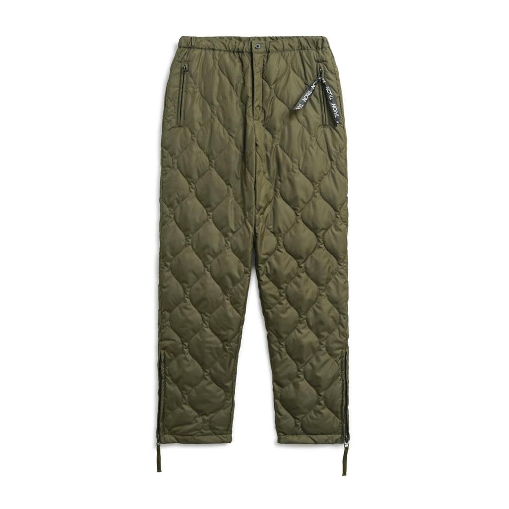 The front placket has a YKK metal snap button (TAION engraved) at the top and a zipper closure. There are zipper pockets on both sides of the hips and back, and zipper slits on the sides of the hem. These parachute down pants are warm and functional, with a beautiful, slim silhouette towards the hem.