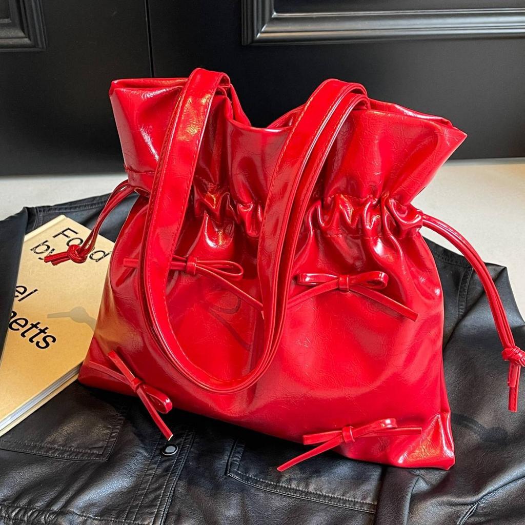 - **Structured Design Details**: Features a stylish bucket bag silhouette with PU material, glossy finish, and drawstring closure accents. It supports versatile carrying options (handheld, shoulder). It exudes chic and versatile charm. Six vibrant color options cater to diverse style preferences.