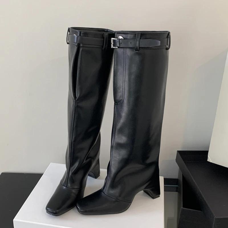 Fashion Eilyken New Winter Street Style Belt Buckle Strap Knee-High Women Boots Square High Heels Booties Stripper Pumps Shoes