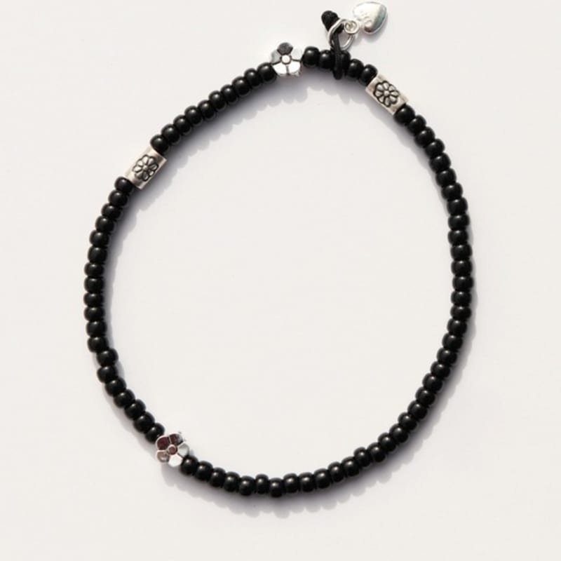 BONBEAU Silver Flower Charms Black Beads Bracelet Silver Flower Charm Black Bead Banding Bracelet