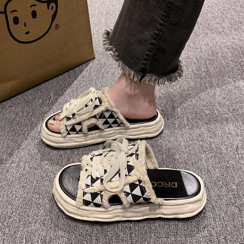Fashion Versatile Thick-bottomed Non-slip Casual Cool Slippers Women's New Summer 2025 Outer Wear Small Fragrant Style Lace-up Slippers
