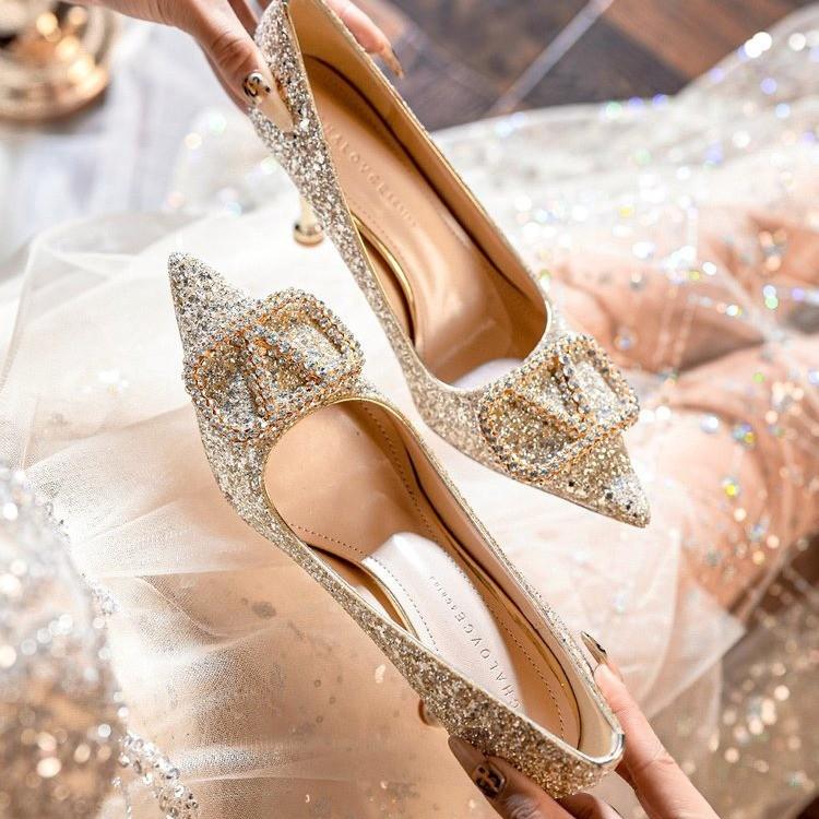 Red Beautiful Wedding Shoes Chinese Xiuhe Bridal High Heels Engagement Stiletto Pointed Single Shoes Sequin Stiletto High Heels
