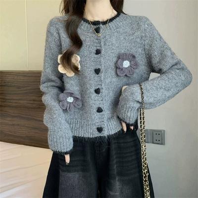 Three-dimensional Flower Love Single-breasted Knitted Cardigan Spring and Autumn New Sweet Round Neck Small Fresh Sweater Women's Coat Tide