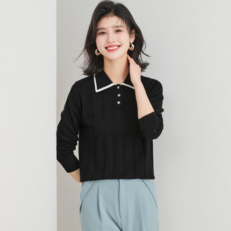 Women's Silk Blend Color Block Hollow-Out Turnover Collar Knit Sweater