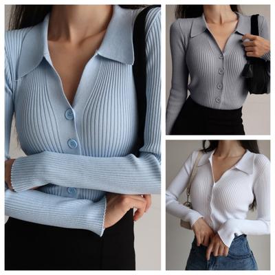 Polo Collar Thin Base Shirt for Women Spring Autumn Long Sleeve Slim Fit Sweater Button Down Cardigan Knitted Sweater Top