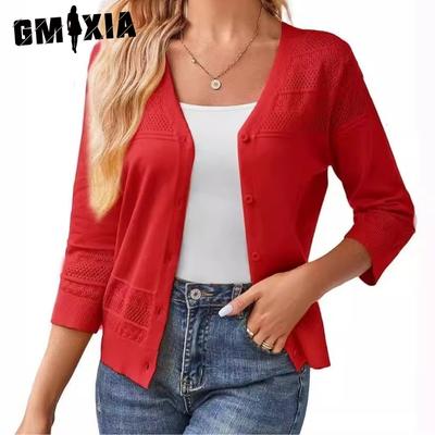 Fashionable Women's Thin Shawl Three-quarter Sleeves Hollow Knitted V-neck Cardigan