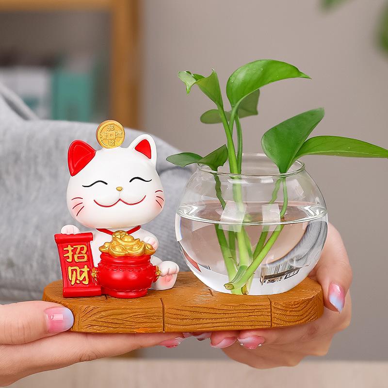 Zhaocai Cat Hydroponic Creative Vase Utensils Vase Living Room Office Desktop Decoration Zhaocai Cat Green Rose Hydroponic