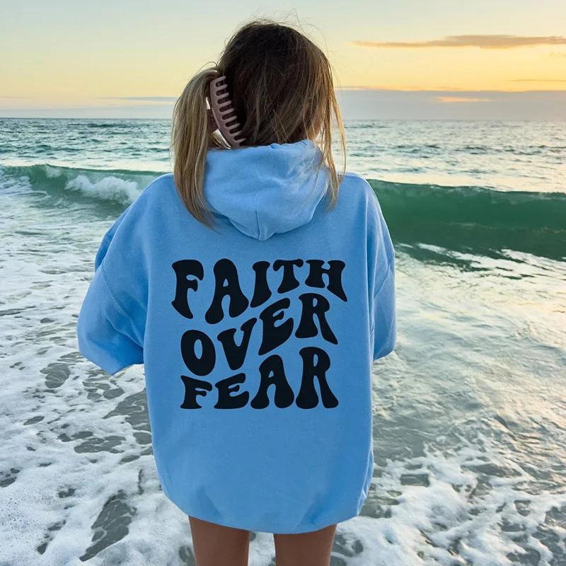 FAITH OVER FEAR Women Plush Sweatshirt Solid Color Letter Print Kangaroo Pocket Drawstring Print Hoodie