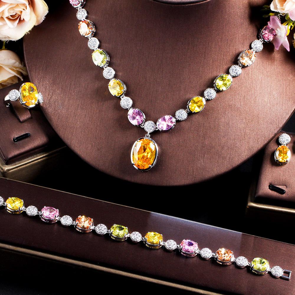 Banquet Dress With Chain Color Zircon Necklace Earrings Ring Bracelet Four-Piece Set